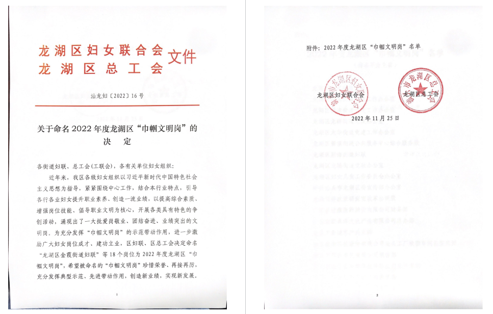 廣東泰恩康醫(yī)藥股份有限公司財(cái)務(wù)部榮獲2022龍湖區(qū)“巾幗文明崗”稱號(hào)