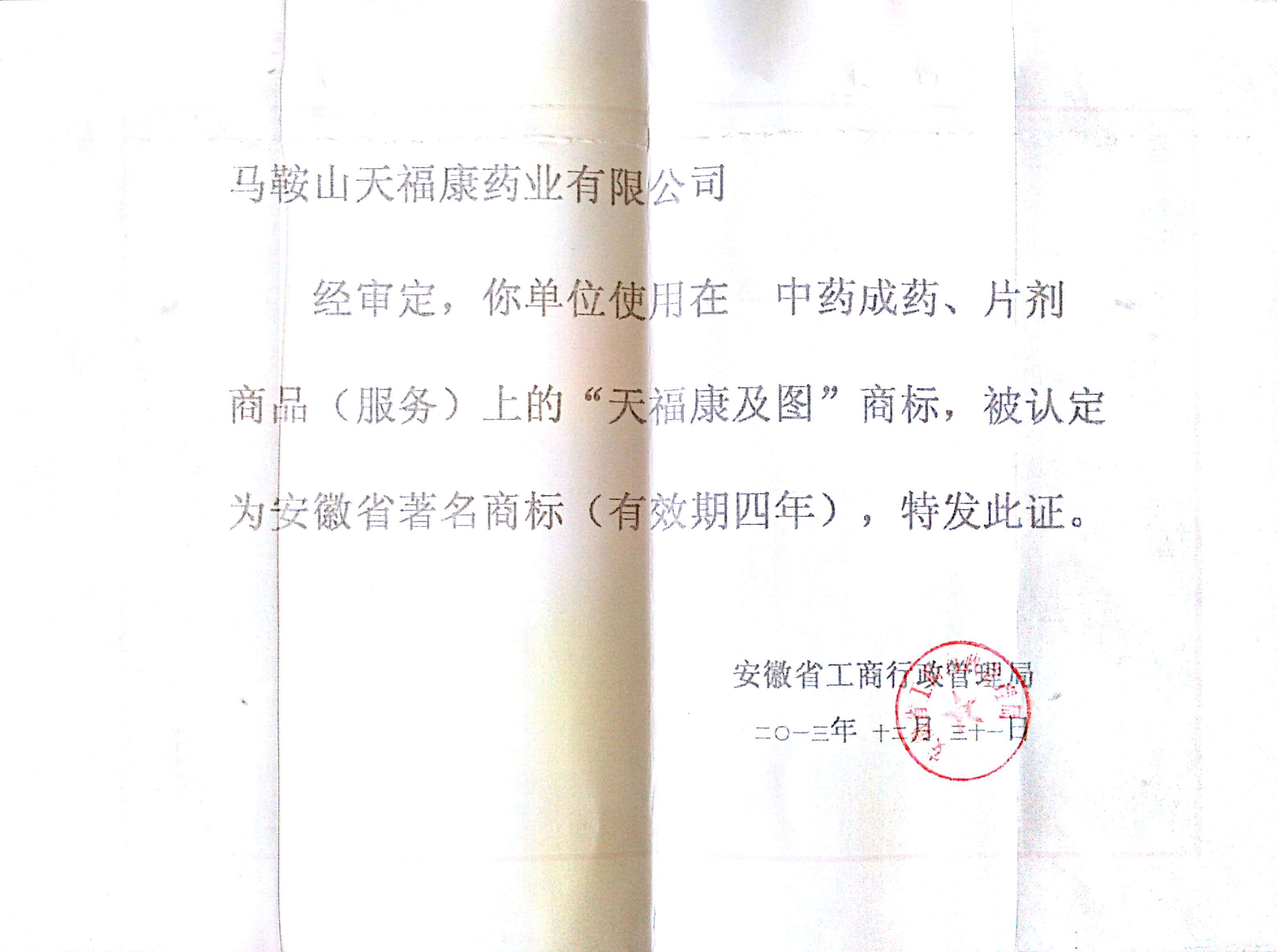 安徽泰恩康制藥有限公司評(píng)為“天福康”安徽省著名商標(biāo)
