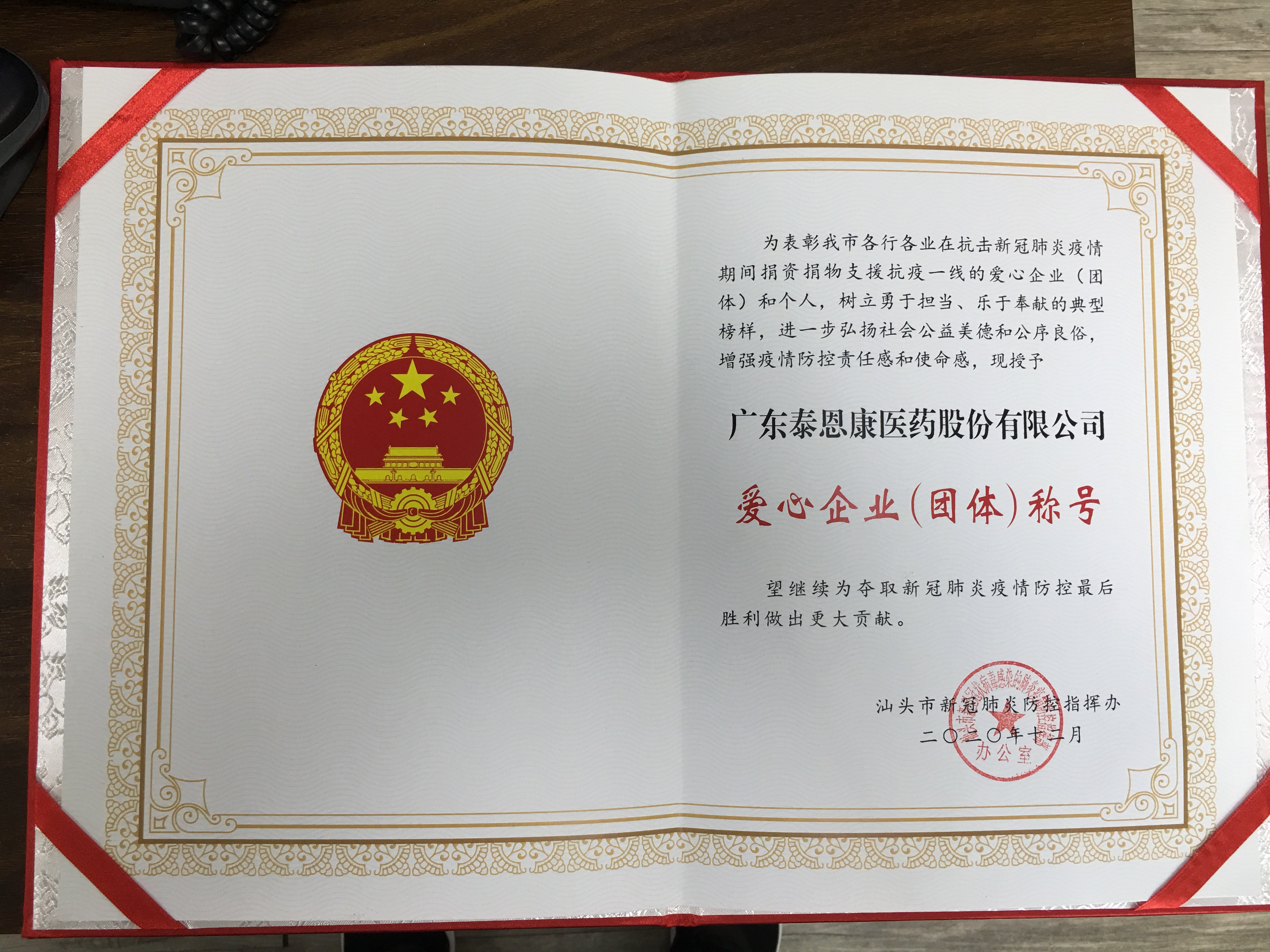 汕頭市抗擊新冠肺炎疫情【愛心企業(yè)(團(tuán)體)】稱號(hào)
