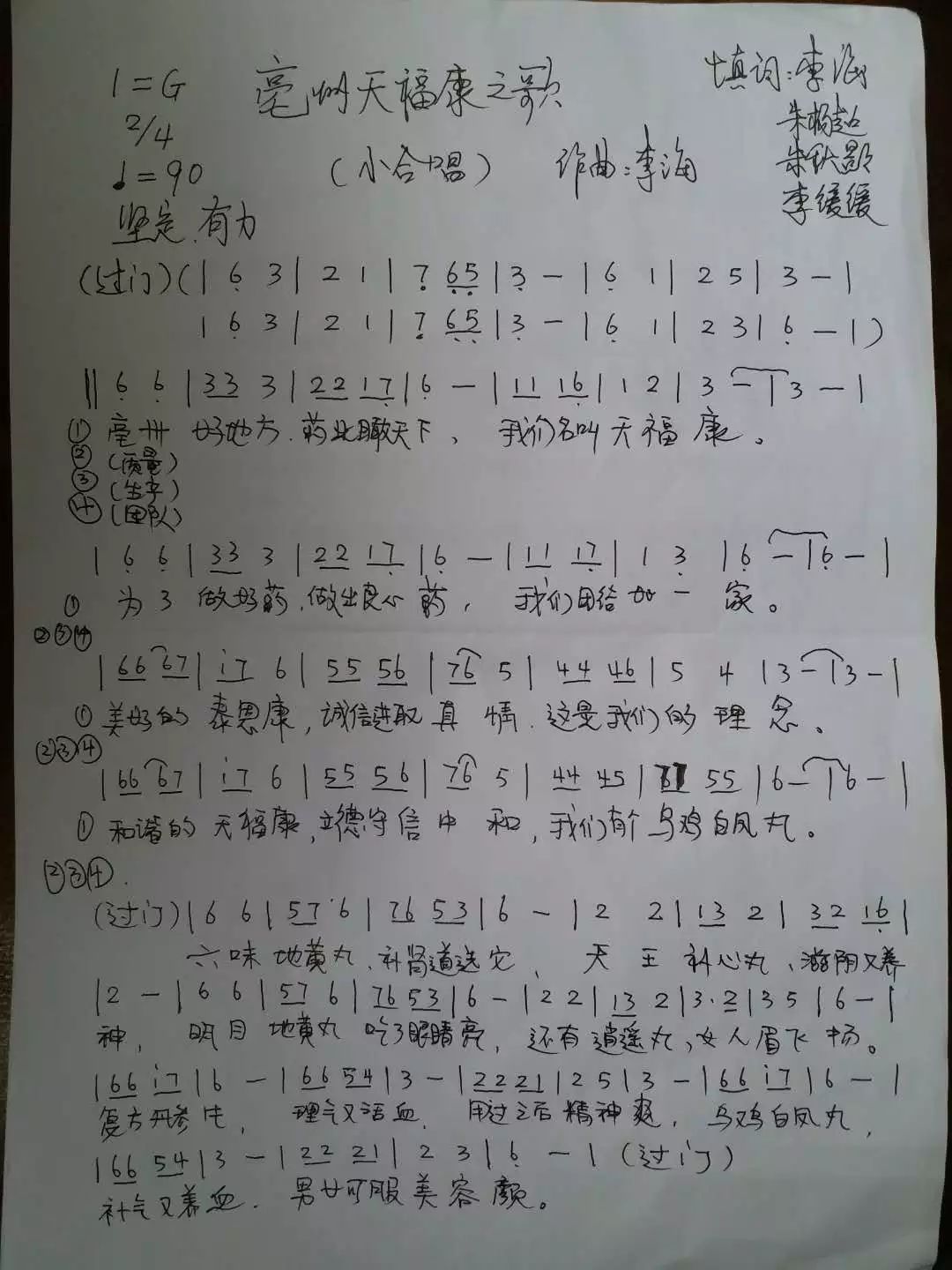 自從被委派到亳州工作,如何提高企業(yè)的凝聚力是我要做的工作之一,而企業(yè)文化的建設便是其中的重要內容。日有所思,夜有所夢。12月22日我出差前一晚,在夢中,自己一直在唱667176,556765這段旋律,節(jié)奏感強烈,剛強有力。待醒后就趕緊爬起來記下(后來成來天福康之歌的主旋律,填上“美好的泰恩康,誠信進取真情”這一句歌詞)。