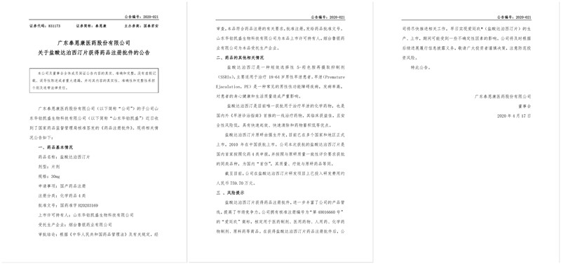 廣東泰恩康醫(yī)藥股份有限公司旗下子公司山東華鉑凱盛生物科技有限公司歷經(jīng)4年研發(fā)的國產(chǎn)首個(gè)治療早泄藥物愛廷玖(鹽酸達(dá)泊西汀片)獲得國家藥品監(jiān)督管理總局(NMPA)的批準(zhǔn),并于2020年4月22日舉行了獲批線上發(fā)布會(huì)。