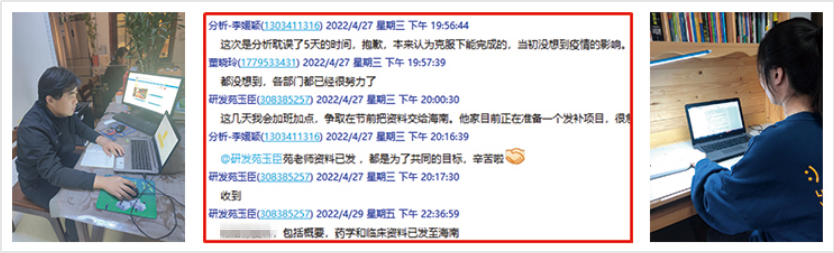 “我們成了密接”、“我們單位樓封了”、“我們小區(qū)封了”,除了駐守實驗室的同事,其他被隔離居家的華鉑同事,也一如既往堅持辦公。注冊部同仁為趕時間節(jié)點,在家里審核、修改申報資料至深夜。