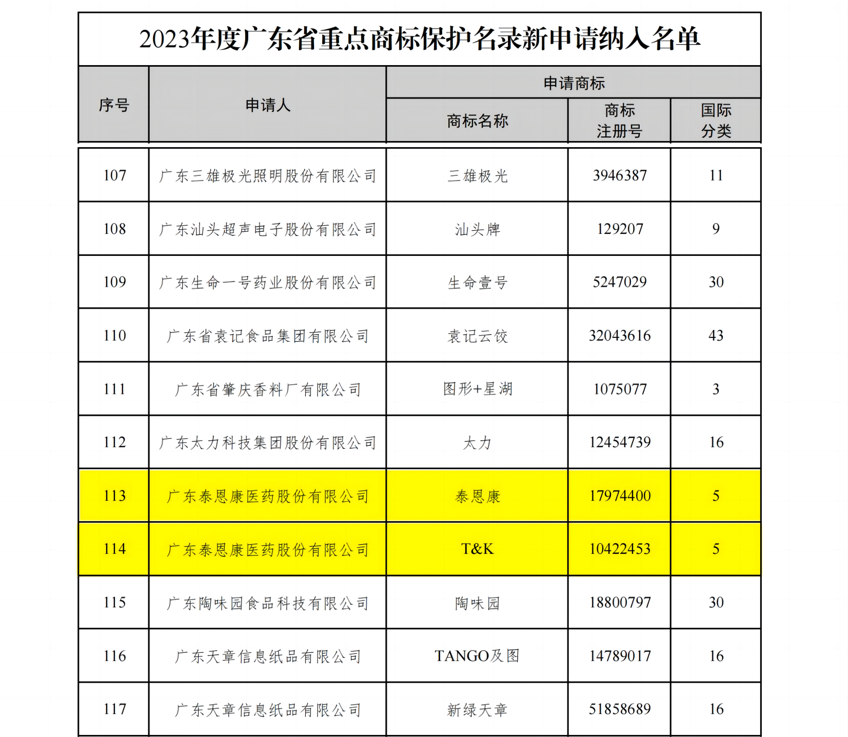 “泰恩康”及“T&K”入選廣東省重點商標保護名錄